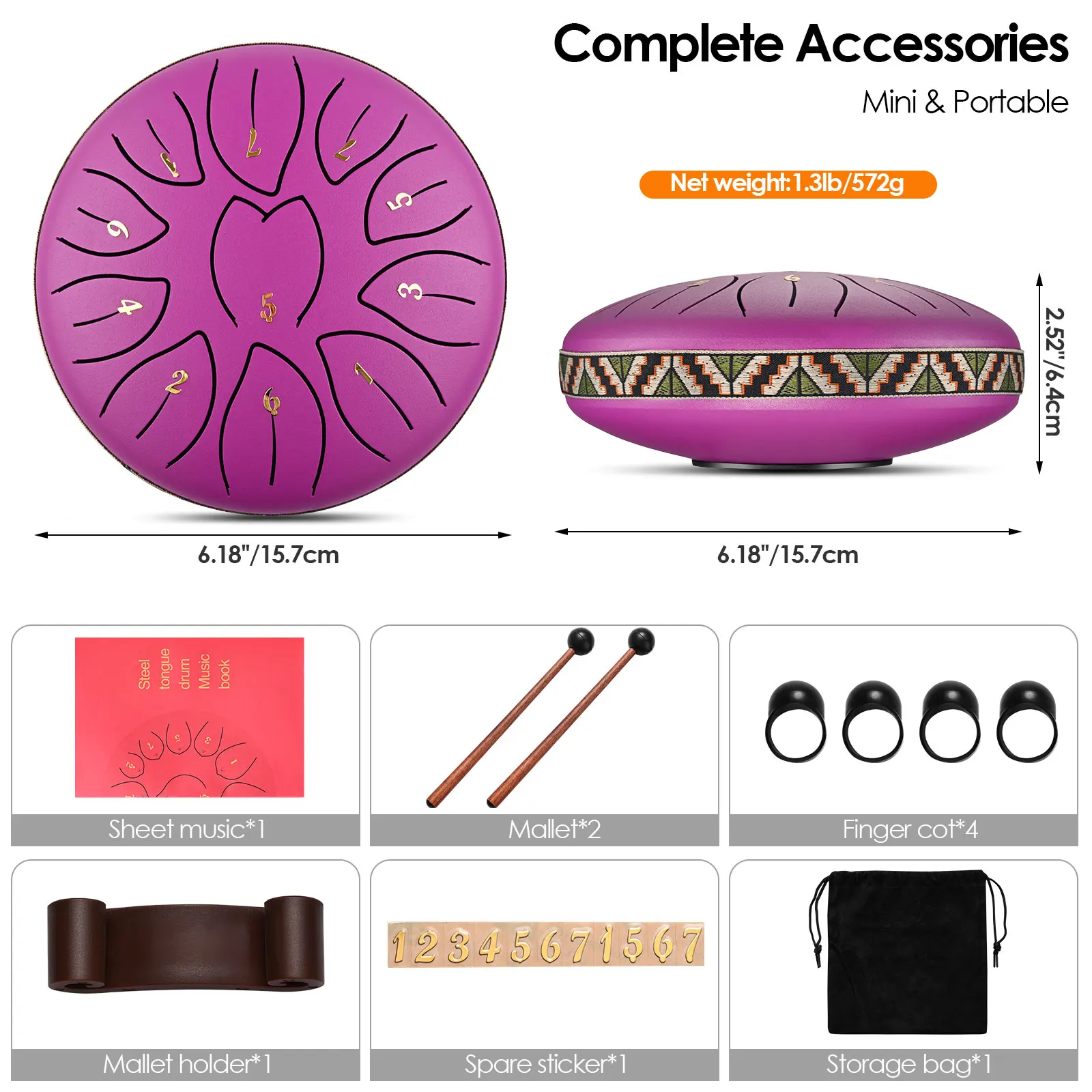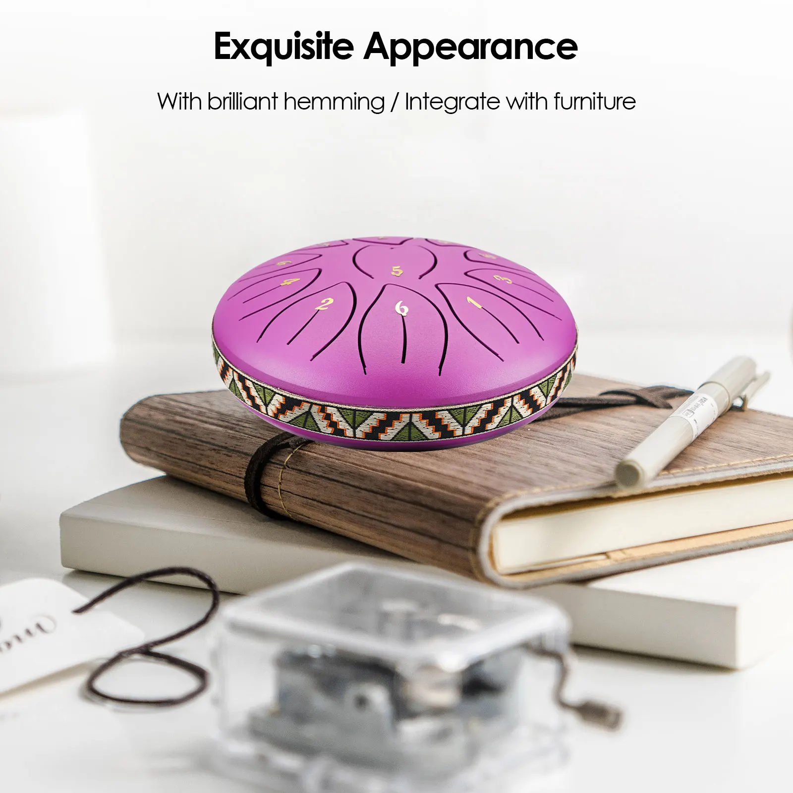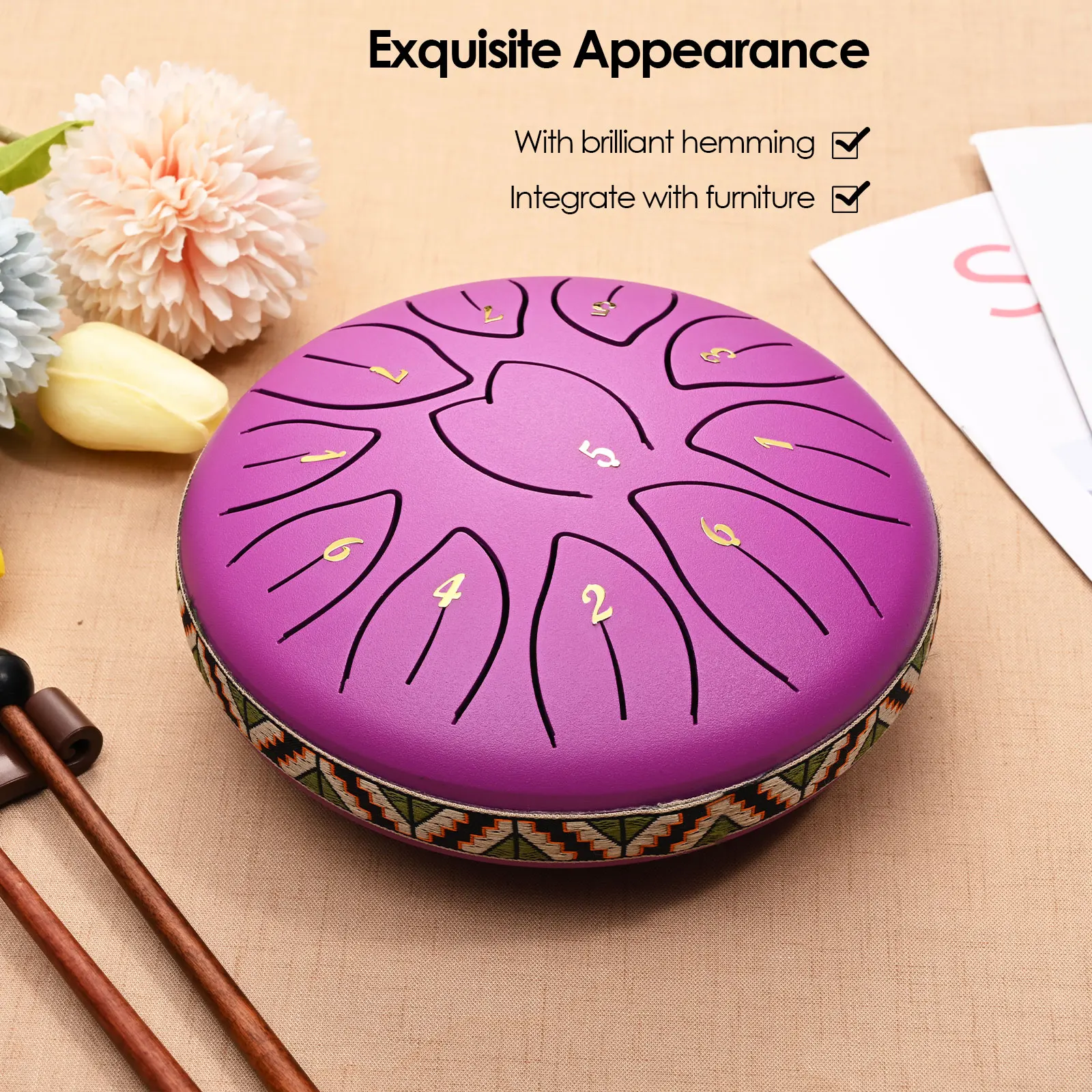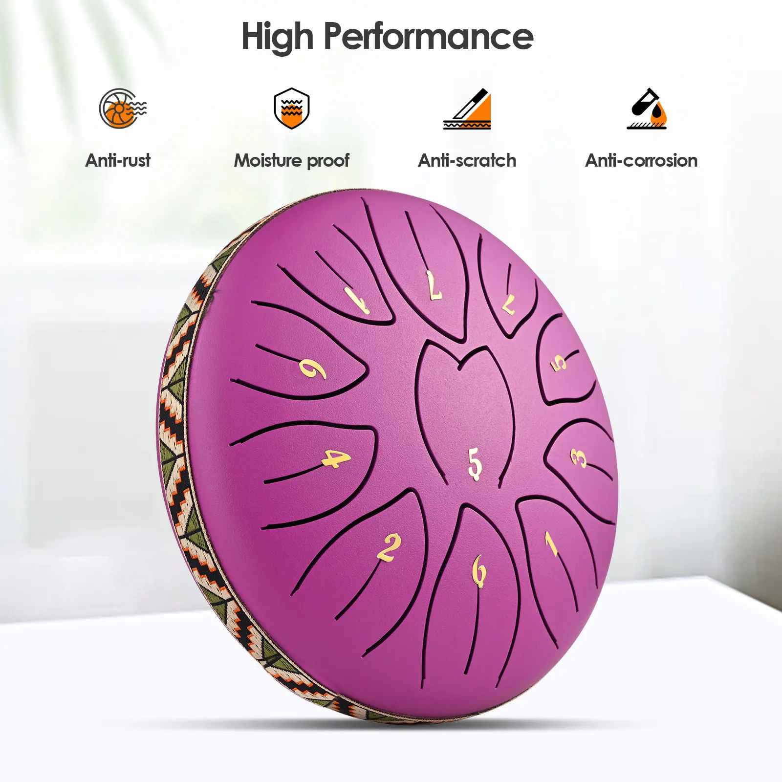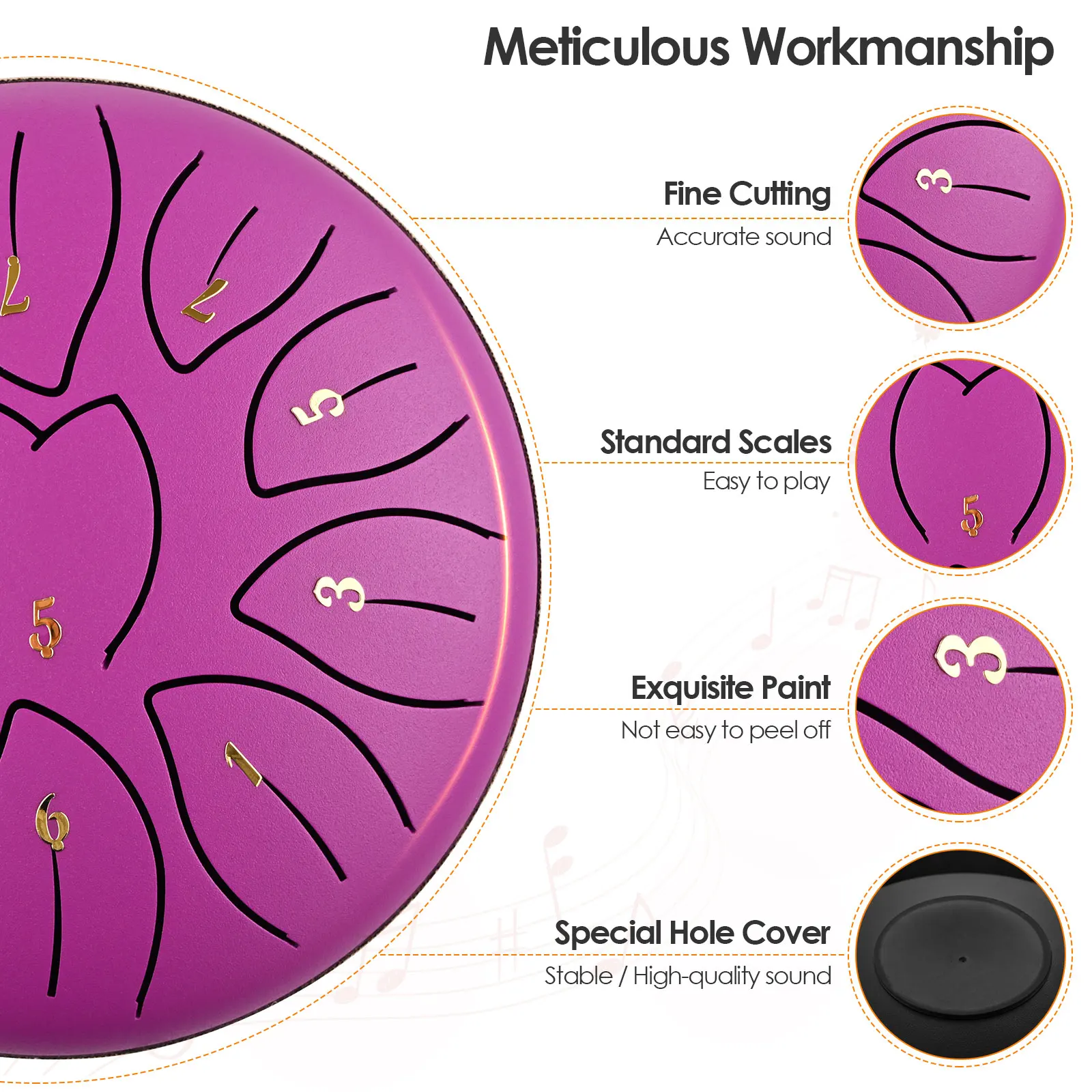 The tongue drum has well-painted surface and is reinforced against scratches and corrosion. Fine cutting and standard music scales ensures accurate sound, and the special hole cover ensures the stability of the drum and high-quality sound while playing.