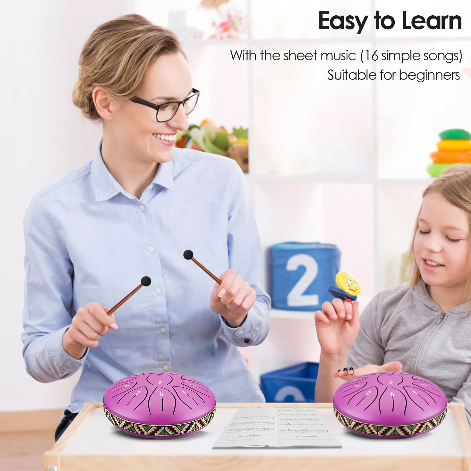 The compact balmy drum has mallets or finger cots for you to play different styles of music. You can also play with your fingers. Beginners can learn and play easily due to the detailed sheet music.