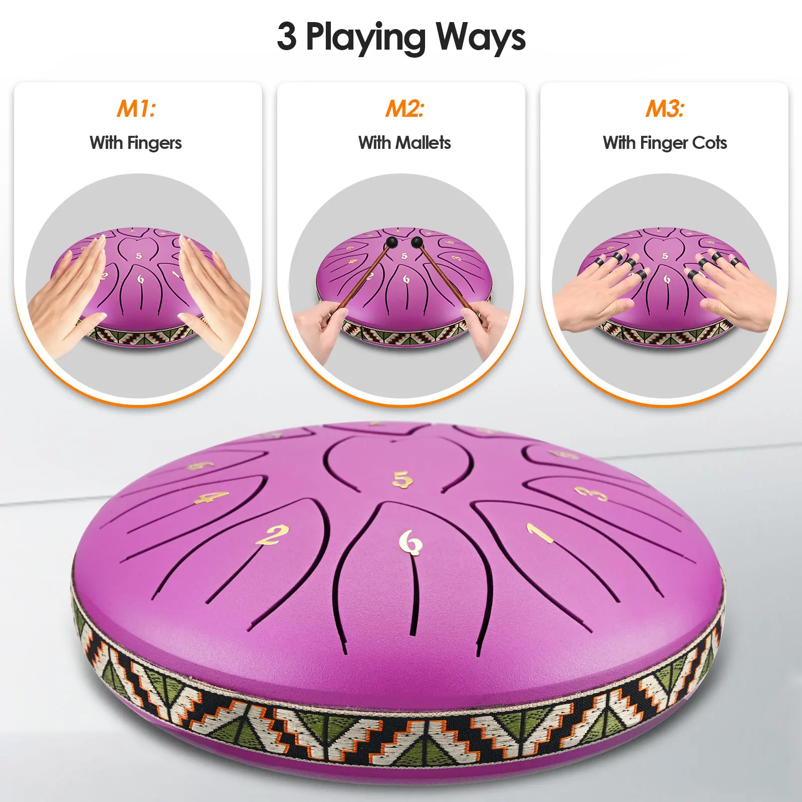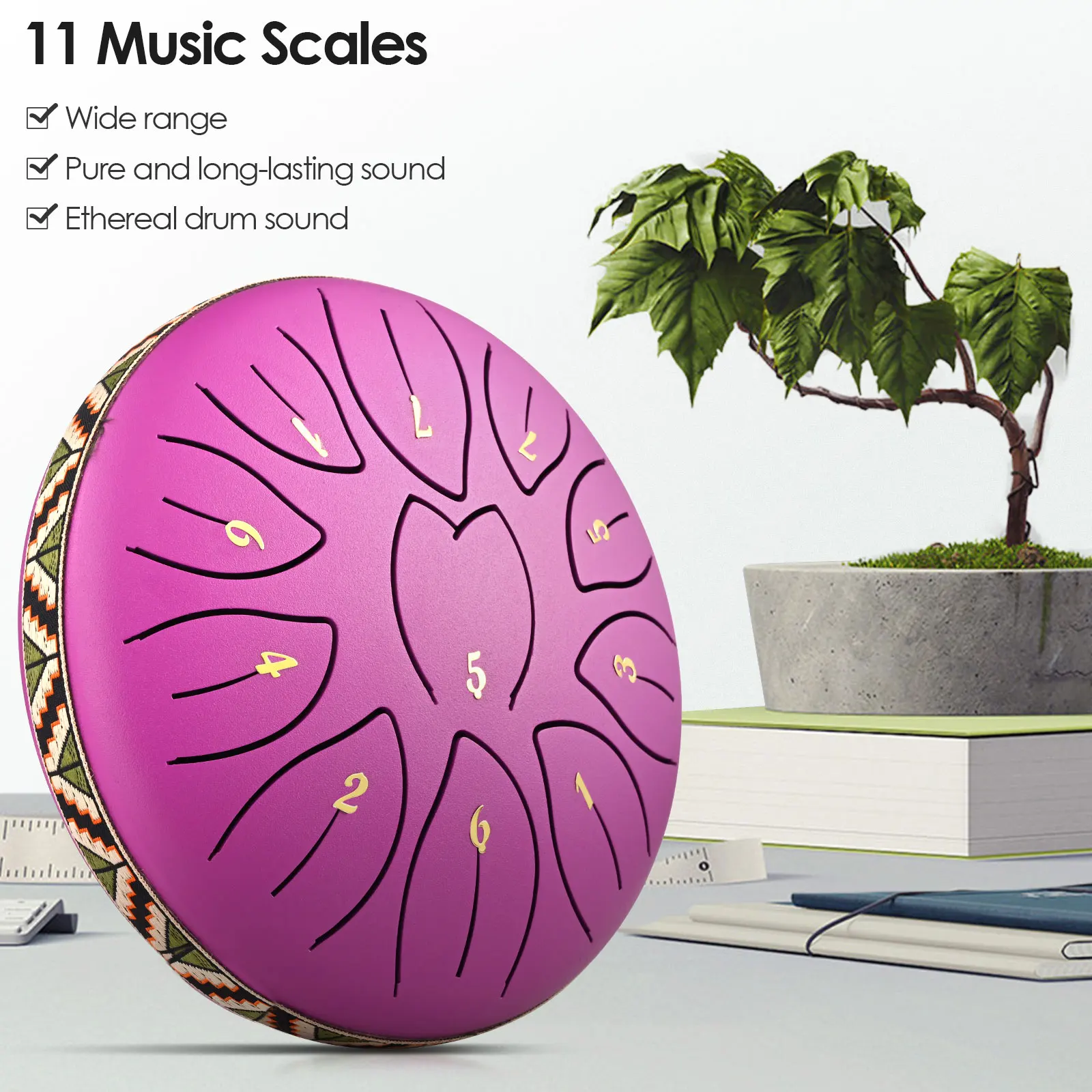 This 6-inch steel tongue drum has 11 music scales. It adopts the international standard pitch with an deviation of no more than 5 cents. The pure and long-lasting sound can heal your soul and relieve the stress.